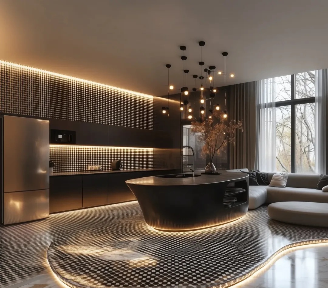 ۶. ترندهای طراحی داخلی ۲۰۲۵ ، مبلمان ارگانیک استفاده از متریالهای بازیافتی خانههای هوشمند آشپزخانههای اپن بدون کابینتهای بالایی نورپردازی خطی مدرن.
